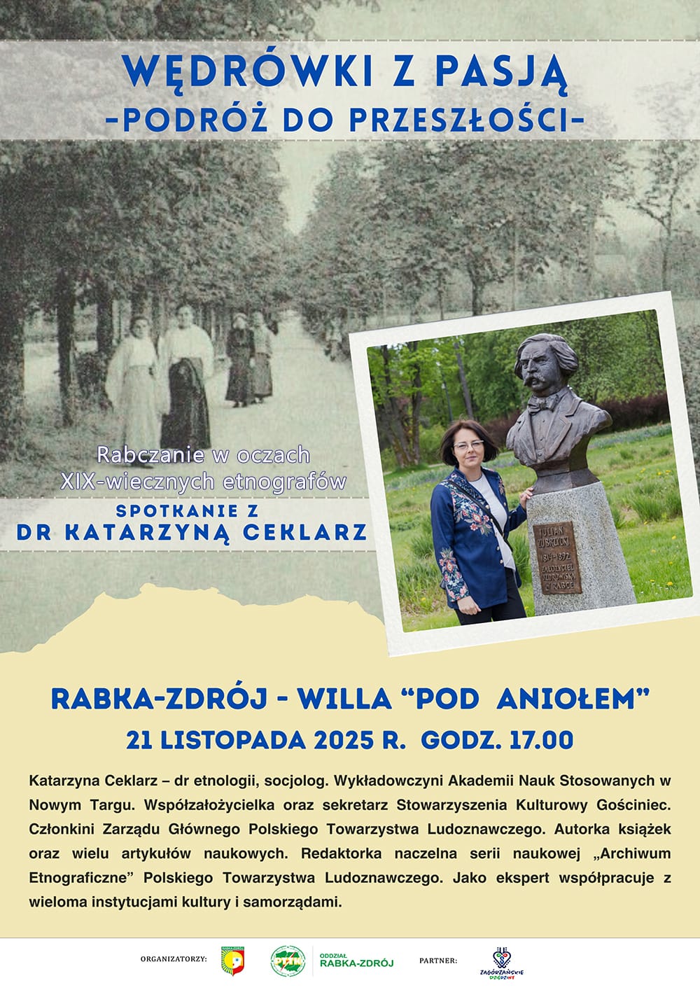 dziewiętnastowiecznych etnografów, podróżników i badaczy kultury ludowej. Omówione zostaną źródła opisujące codzienne życie, obyczaje, strój oraz gwarę Rabczan, a także sposób, w jaki ówcześni autorzy – m.in. Izydor Kopernicki i Bronisław Gustawicz – postrzegali miejscową społeczność. W trakcie wykładu przeanalizujemy, w jaki sposób XIX-wieczne obserwacje przyczyniły się do budowania tożsamości regionalnej i jak kształtowały późniejsze wyobrażenia o Rabce jako ważnym miejscu wypoczynkowym na pograniczu