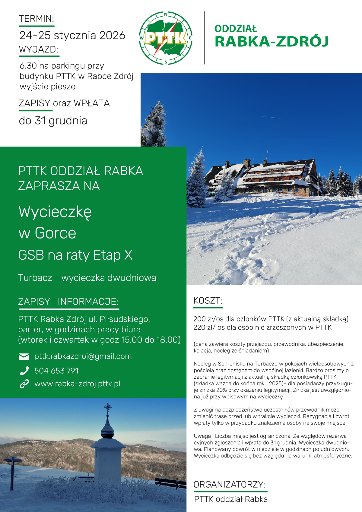 Z uwagi na zimowe warunki zdecydowaliśmy się podzielić X -Ty Etap GSB na 2 dni z noclegiem w Schronisku PTTK na Turbaczu. Przejście rozpoczniemy przy biurze PTTK w Rabce i dalej przez Maciejową – Stare Wierchy – Obidowiec – Rozdziele dojdziemy na Turbacz 1310 m.n.p.m a potem udamy się do Schroniska na Turbaczu, gdzie spędzimy noc. W cenie zapewniamy wieczorną kolację ( bigos ) i poranne śniadanie . Wieczorem zapraszamy wszystkich uczestników na wspólne kolędowanie.